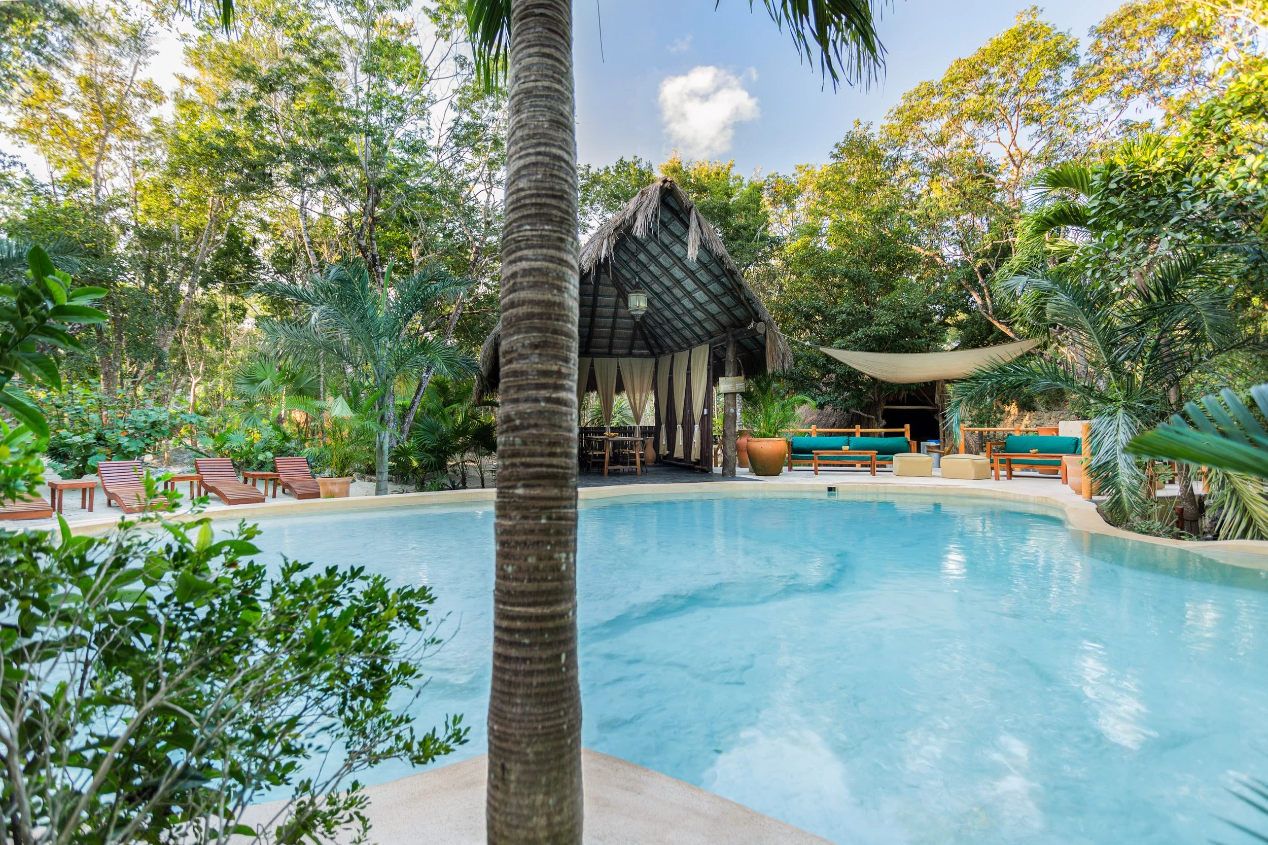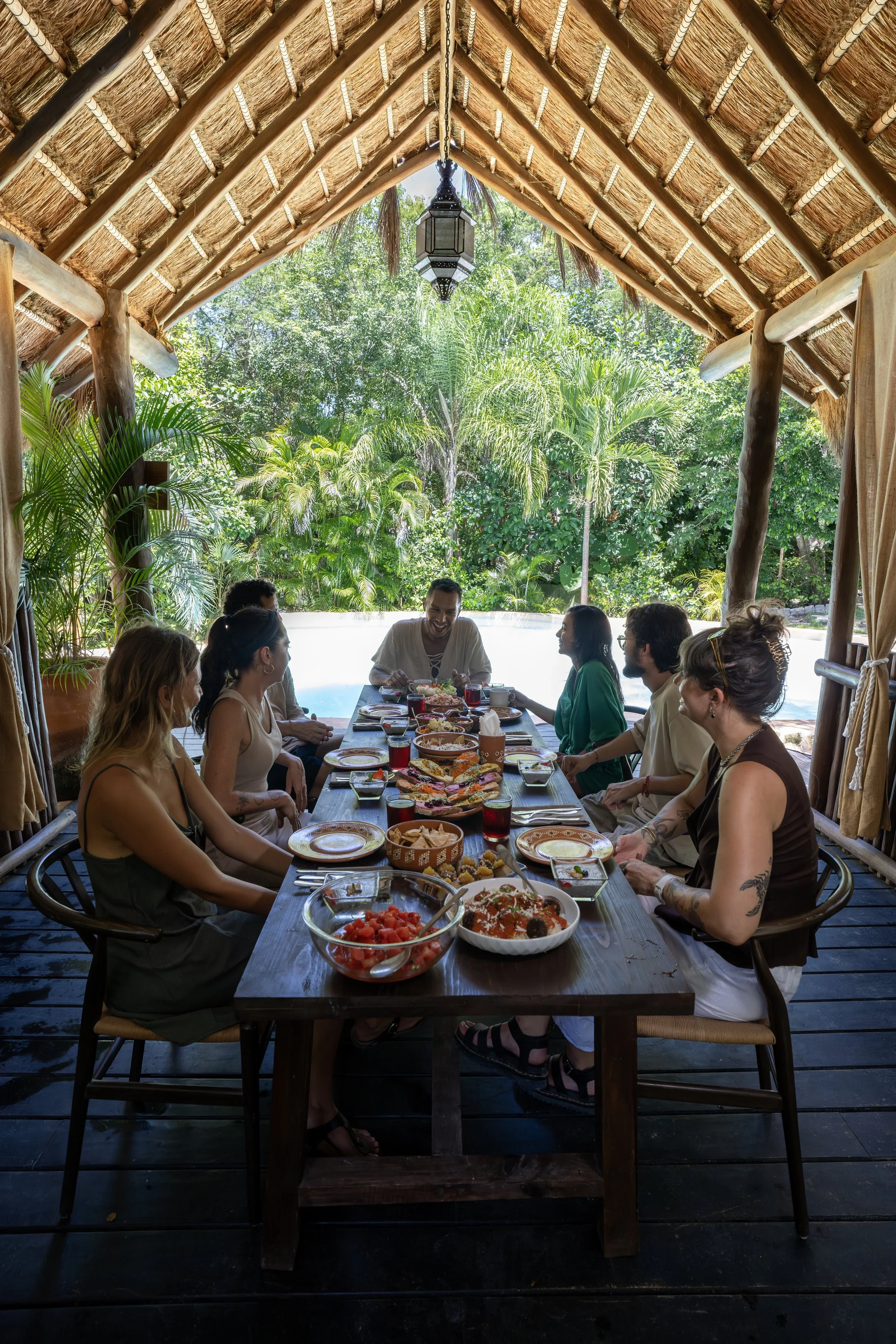 Your retreat sanctuary, Dora, is tucked into this tranquil landscape. Surrounded by swaying palms, jungle stillness, and curated beauty in every corner, Dora feels both grounding and elevated—a place where you can truly exhale. The property boasts its own exclusive cenote, offering a rare and sacred place to swim, float, and meditate in crystalline waters. Architecturally stunning shalas provide dedicated spaces for both communal practice and personal retreat time so you can nourish yourself completely and return home radiant, clear, and renewed.
